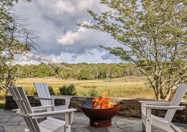 Perched above the streets of a historic New England neighborhood, this residence enjoys magnificent views of the salt marsh beyond. The dramatic grade change is directly navigated by a grand set of bluestone steps embedded in native plantings, while sloping grass paths accommodate less mobile visitors. Historic bricks uncovered during the demolition of an existing chimney were thoughtfully reused in the walkway to the newly defined parking area, offering a tangible link to the site’s history. The upper bluestone terrace captures a long view along the western side of the marsh, framed by large existing pine trees. The lower terrace is easily accessible through exterior stairs or the walkout basement and highlights a more intimate view of the marsh. Long curvilinear stone walls flank the lower side of the property while native trees, shrubs, and meadow envelop the space, creating the perfect place to gather around a fire and enjoy the view.