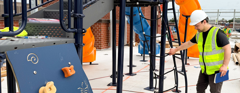 Another one of our school playground projects is in construction, this time on a roof! A recent site visit to the new Leahy Elementary School in Lawrence, MA included checking the placement of play structure elements and watching as trees were lifted several stories into the air!